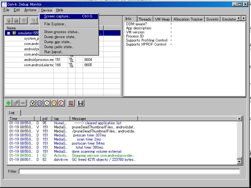 「Dalvik Debug Monitor」(Androidが搭載するデバッギングツール)が起動します。