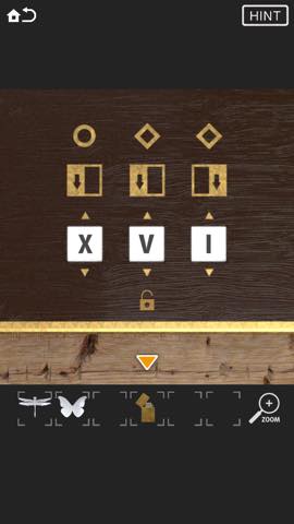 ソファーの側の木箱をタップして拡大。「↓」はローマ数字を半分にわけたときの場所を示している。