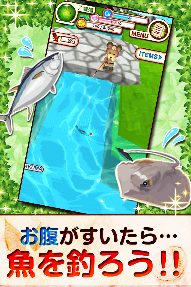 探索をつづけるには川で魚を吊り上げで、お腹を満たさないと行けません。ココらへんがクマっぽい。