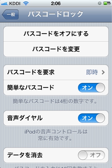 iPhone4sにロックをかけて他の人に操作させないようにする[パスコード]の設定方法メモ。