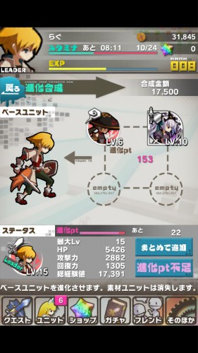 そのかわりにガチャや敵を倒したときに手に入るユニットを合成して、自分のキャラクターを強くしていく。